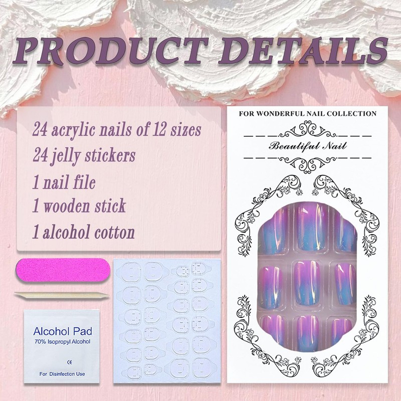 - 【Package Includes】 24 pieces medium fake nails, 1 sheet of 24 pieces jelly glue, 1 piece of mini nail file, 1 piece of wooden stick and 1 piece alcohol pads.