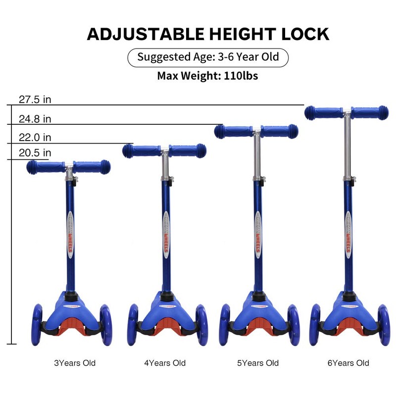 - Adjustable Handlebar Height: Our kids scooters with adjustable height aluminum alloy handlebar can be adjusted from 20.5 to 27.5 inches, with a max weight of 110lbs, great for 3-6 years children.