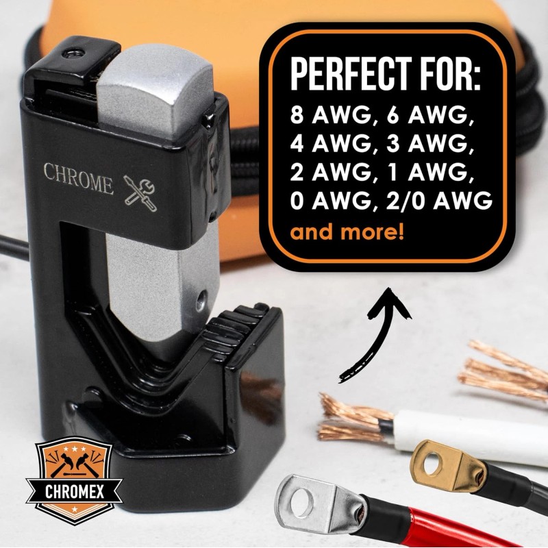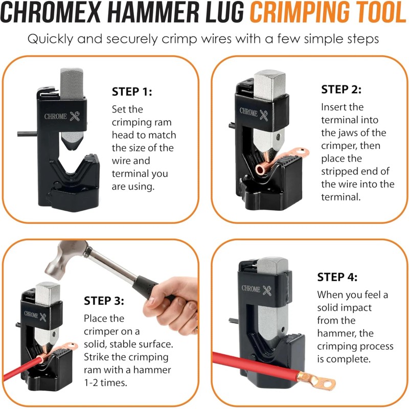 - Professional Crimp: The Chromex Hammer Battery Lug Crimper can be used on 8 AWG to 2/0 AWG cables. In addition our customers have used this product for solar connections, garden tractors, golf carts, power cable terminal ends, insulated battery terminal, automotive cable lugs, inverters, rv house battery banks, Anderson 50 connectors, boat rewiring, amp install, audio system power cables, larger ring terminals, solar systems, small ring terminals, welding, and battery cables.