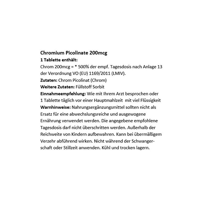 Chromium Picolinate 200 mcg – 750 Tablets – No Magnesium Stearate – Made in Germany