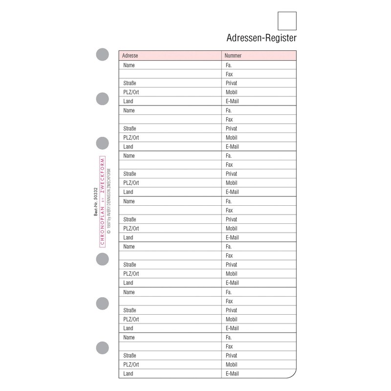 Chronoplan 50332 Adress-Einlagen zum Nachfüllen für Terminplaner Midi (96x172 mm, 16 Adressblätter mit Universallochung, 80g/m², übersichtliche Adresssammlung von Kontaktdaten, für viele Organizer)