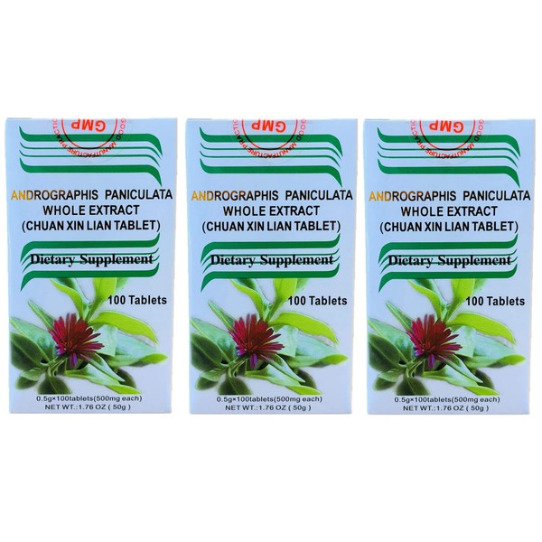 Chuan Xin Lian, Andrographis Whole Extract, Extra Strength 500MG (100 Tablets) - 3 Bottles
