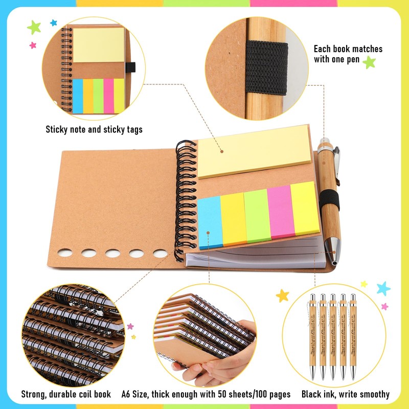 - Reliable Material: the ballpoint pen is made of bamboo wood material, providing you with a smooth writing experience; The spiral journal cover is made of kraft paper, each has 50 sheets, and the paper is thick; The journal also comes with sticky note and sticky pad inside; The pen loop on the side of the notebook can fix the ballpoint pen so that it is not easy to lose