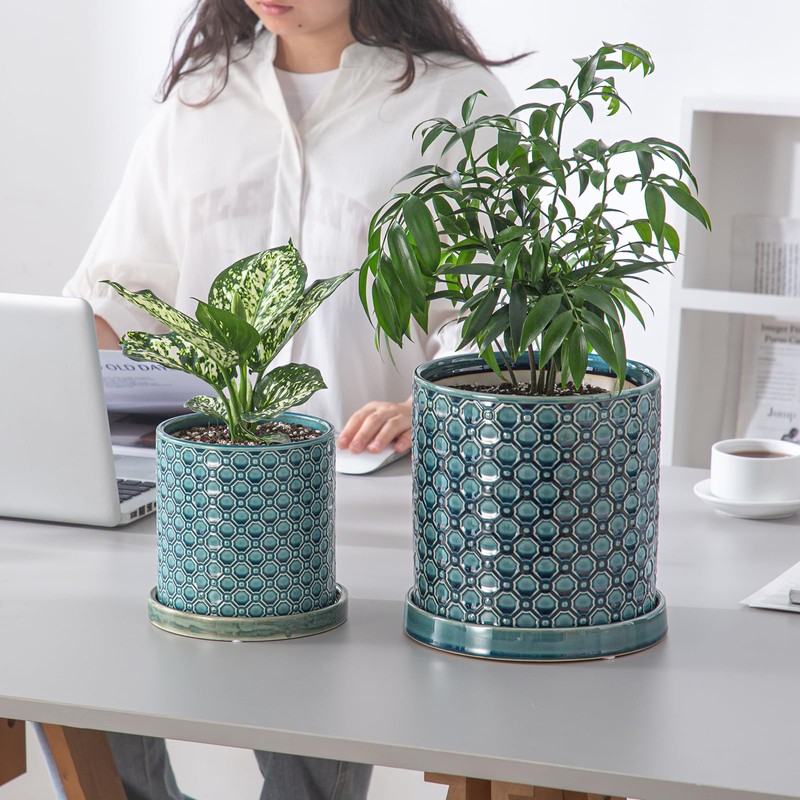 Chubacoo 6 Inch Plant Pot: Ceramic Planter with Drainage Hole & Saucer Indoor Outdoor Plants - Cylinder Round Flower Pot for Home Office - Modern Decorative - Small Blue