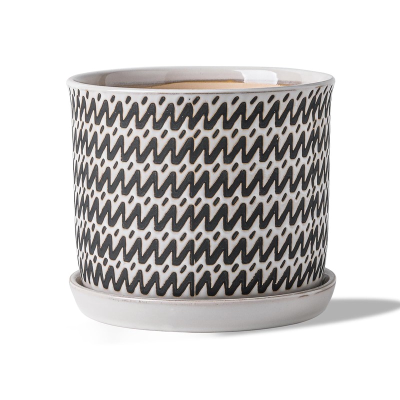 Chubacoo 8 Inch Plant Pots: Ceramic Planter Pot with Drainage Hole & Saucer - Planters for Indoor/Outdoor Plants - Flower Pot with Bonded Tray for Home/Office - Wave Stripe Debossed