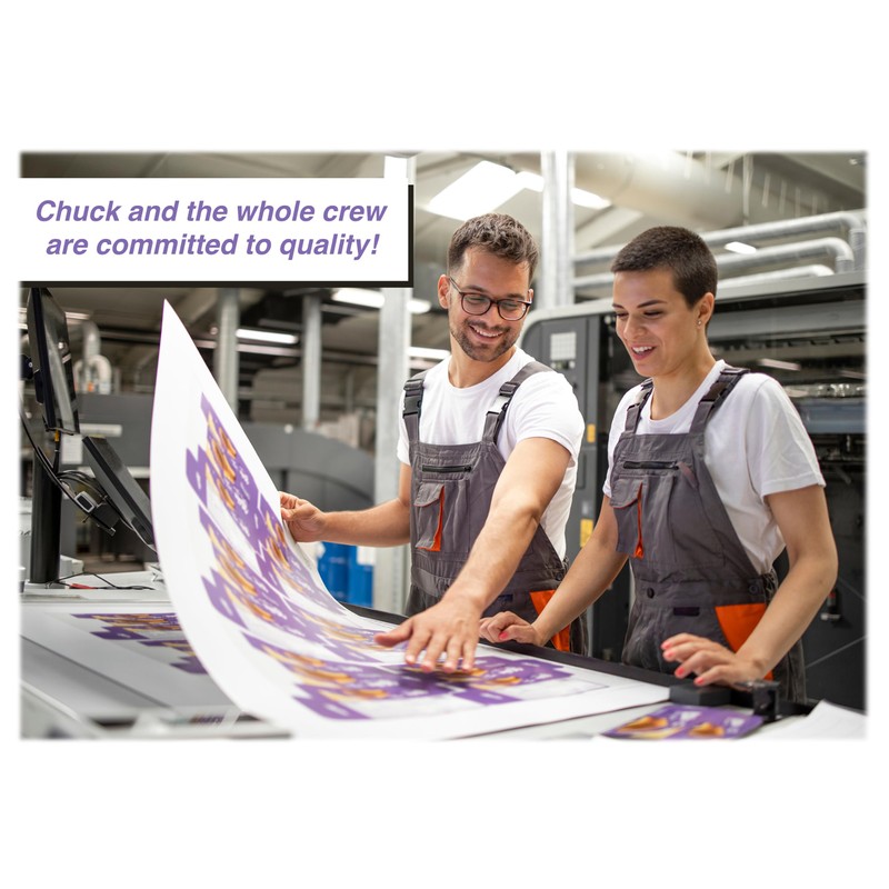 • CHUCK'S PERFECT GREETING CARDS are printed in CHICAGO and feature premium, eco-friendly paper. Printed on double thick, 14 point C1S, premium glossy card stock from eco-friendly, sustainably managed forests and American paper mills. Pre-printed retail on card is $5.99. You pay $4.49, that's a savings of $1.50.
