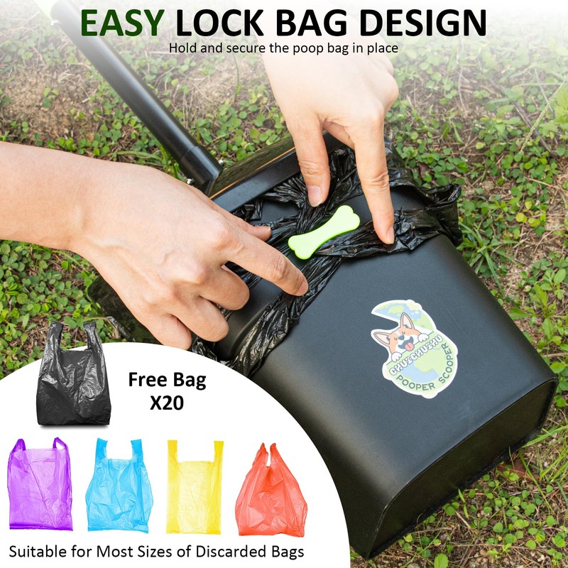 - Convenient Poop Bags: The Dog Poop Spoon Metal Set also offers 20 garbage bags, and to prevent the garbage bags from moving or falling, the locking device in front of the rotating bucket can secure the handles at both ends of the garbage bags.