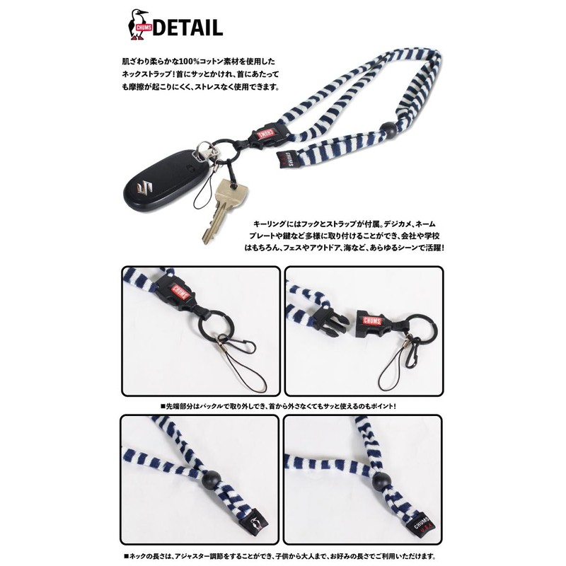 A neck strap derived from the original retainer (glasses strap) originated from CHUMS. There is a ring strap and hook on the end of the buckle so you can hang small items from your neck.