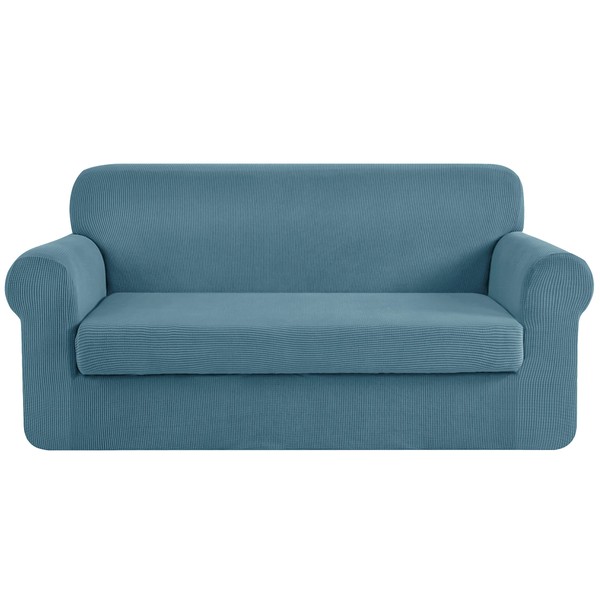 CHUN YI Stretch Loveseat Sofa Slipcover 2 Piece Sofa Cover, 2 Seater Couch Slipcover Coat Soft Washable Furniture Covers with Elastic Bottom, Checks Spandex Jacquard Fabric, Medium, Smoky Blue