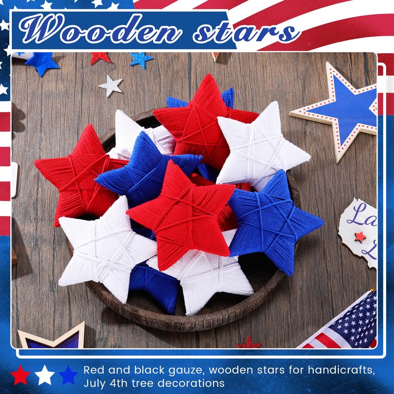 - Quality Materials: 4th of July yarn wrapped star ornaments are made of red, white and blue yarn and wood pieces, tough yarn hand wrapped around the wood pieces; Sturdy and durable, not easy to break and deform, feel comfortable, can be applied for a long time; Harmonious color is easy to match with other home decorations, can quickly attract people's attention