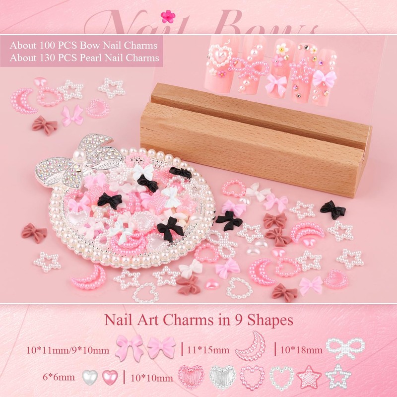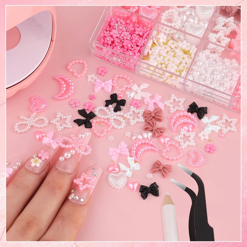 - 🎀 Package Content -- It comes with assorted nail charms, including 4-color bow nail charms, mixed Bow Heart Star Moon nail charms, pink and white flower nail charms with mini metal caviar beads, and flatback pearls for nails. Tweezers and picking pencil are also equipped for your convenience.