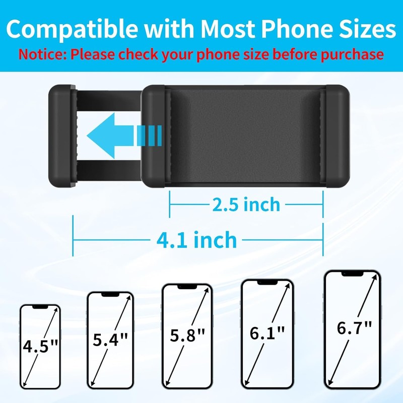 - Widely Compatibility: The phone clip can be adjusted to fits nearly all smartphones of 3.5~7.5 inch. Such as for iPhone 15 14 13 12 11 XR MAX Pro X Plus, for Samsung Galaxy S32 S22 S21 Note Moto X, and for Huawei Google Pixel and other more cell phones. And the flexible phone mount is designed with 2 standard 1/4" screw holes in different positions,which can place the phone horizontally or vertically depending on your needs