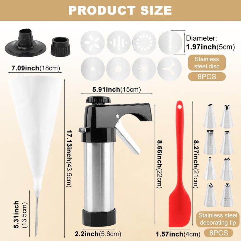 【Packaging Content】 The cookie press includes a stainless-steel cookie press, 8 discs, and 8 frosting nozzles. You can use the stainless-steel nozzles to make different exquisite decorations for your cake.