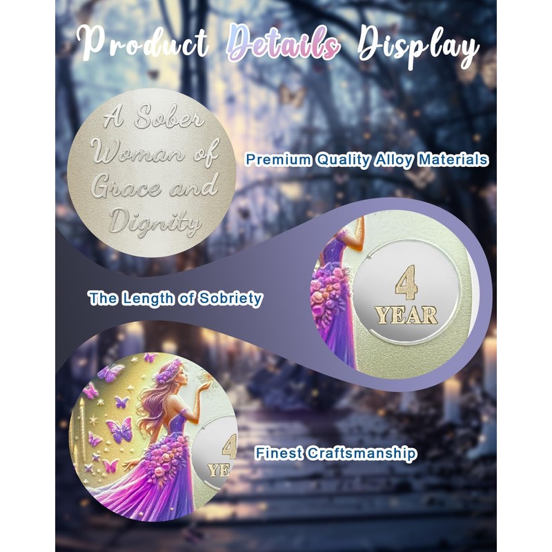 - Stunning Original Design: The obverse of this 4 year sobriety coin depicts a woman in a purple gown, standing in a dreamlike world of butterflies with warm candles beside her. The butterfly represents rebirth and transformation, while the candle symbolizes light and hope. The inspirational message on the reverse empowers women in sobriety, instilling strength and pride, and celebrating the self-esteem and grace that come with living a sober life