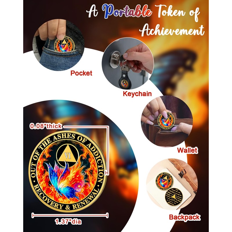 - Inspirational Message: The image of a butterfly rising from flames on this sobriety chip captures the journey of reclaiming life through pain and addiction, symbolizing growth and transformation even in the hardest times. It speaks to strength, hope, and faith, reminding you of your power to believe in your recovery and rise above fears when you feel lost. This coin inspires you to stay positive on your path, seek inner peace, wisdom, and courage, and to keep moving forward with confidence