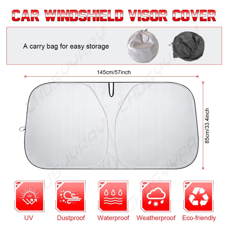 🚗【Will fit all SUV's, Trucks, Vans, and Cars with windshields not exceeding 57x33.4 inches!】:Shades measuring 145cm x 85cm/ 57" x 33.4"INCH, you could easily adjust it to your windshield size. UNIVERSAL FIT - fits most Standard Cars, Mid-Size SUVs, Trucks and Sedans.