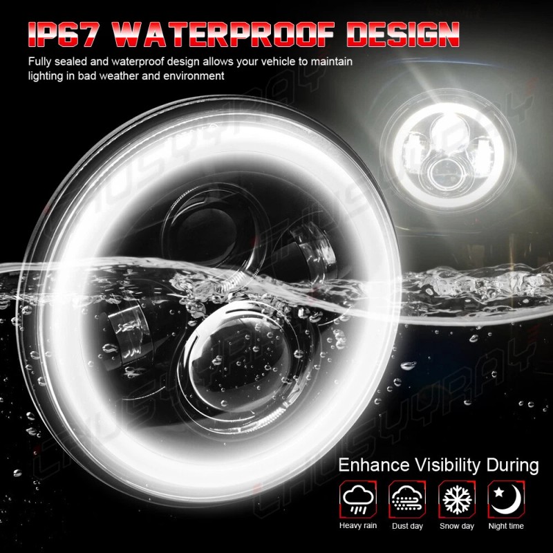 Our 7'' LED Headlights are well constructed. They come with Double Breather Valve to prevent water getting inside. Avoid moisture or condensation in foggy or raining days. IP68 rated waterproof, can work well in rainy days, snowy days and other weather conditions.