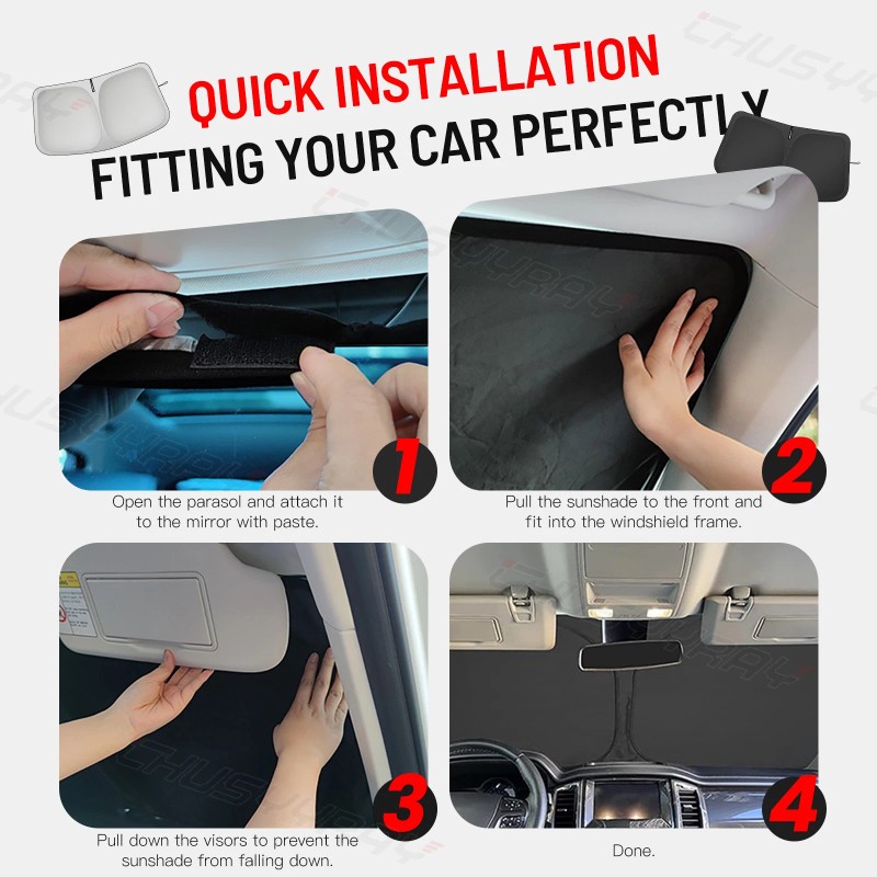 ❄️Quick Installation: Can be installed in just 1 minute! Simply align the sunshade (silver side facing outward) with the windshield and secure it using the car’s sun visor.