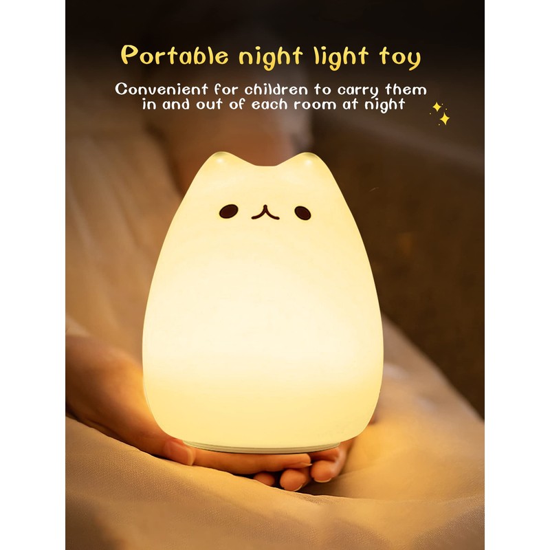 - Sensitive Tap Kontrolle Sobald Sie die Silikon-Nachtlampe öffnen, indem Sie die ON / OFF-Taste auf der Rückseite der Lampe drückt, wird es an warmem Weiß-Modus beheben. Und das Kinderzimmer Licht empfindlich Tap-Steuerung. So können Sie den Modus durch Hahn ändern, um die Silikonoberfläche erste Hahn tritt 7-Farbwechsel-Modi. Und der zweite Hahn die Katze Licht auf Ihrer Lieblingsfarbe zu fixieren. Der dritte Hahn die Lampe und tippen Sie erneut zu schließen, um es Weiß-Modus erwärmen zu lassen