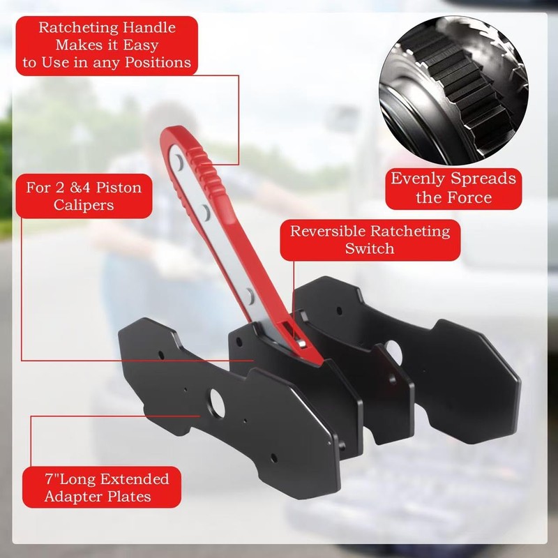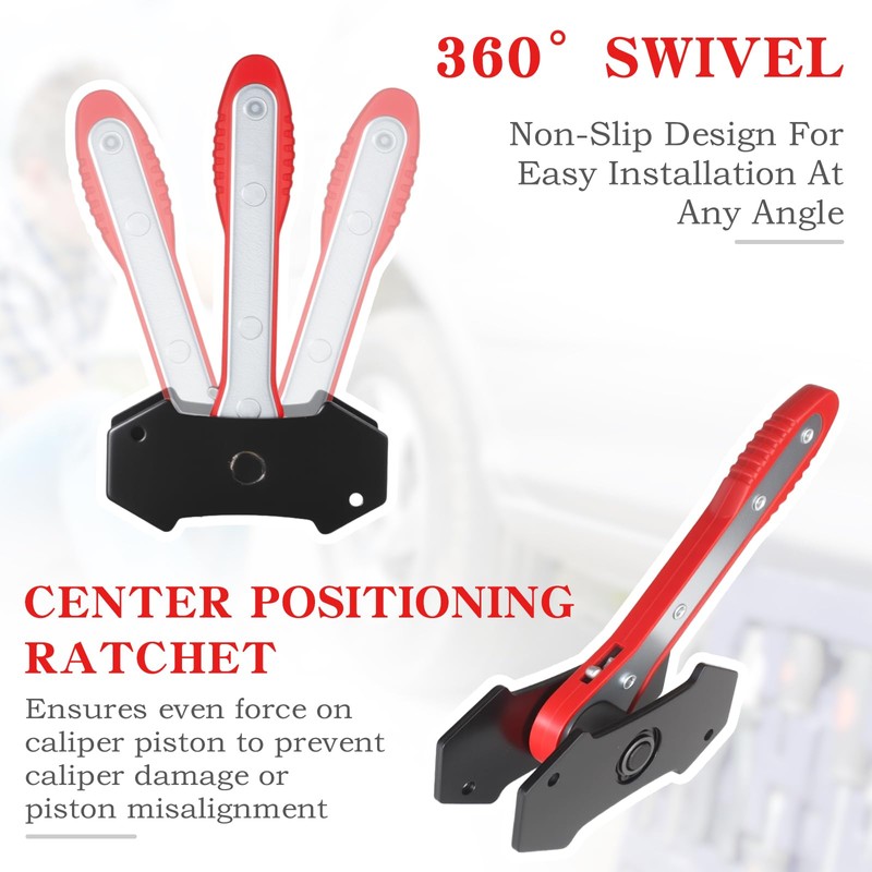 - 【360° Dual-Action Ratchet System】Brake caliper press tool design enables full 360° positioning with a single-handed swing that effortlessly and smoothly presses single, dual or quad pistons back in with one hand. The ratchet is located in the center of the brake caliper tool, and the two spreader plates remain parallel, ensuring that the pressure is evenly distributed when compressing the piston, providing stability and preventing any potential damage to the piston