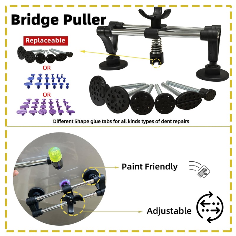 - Multifunctional Bridge Repair Tool This multi-functional bridge repair tool includes a dent lifter repair function and a bridge dings repair function,and is a new upgraded version.5pcs black tabs and 60pcs dent puller tabs are also applicable for this tools.It is suitable for different size dents.Such as door dings and hail damage,engine hood dent and so on.More importantly,It is not easy To be broken while pulling out a dent