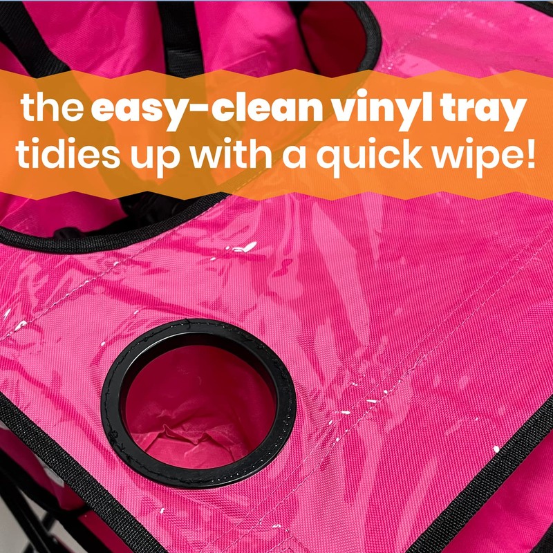 - EASY TO CLEAN FEEDING TRAY - This travel high chair is compact enough for camping, beach days, picnics, vacations, tailgating, and more. This portable high chair includes a built-in feeding tray and cup holder. The chair is made of durable nylon fabric and the tray is covered in clear vinyl that easily wipes clean with water.