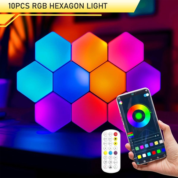 Ciascy 10Pcs RGB Hexagon Light Panels LED Wall Lights, Smart Modular Gaming L...