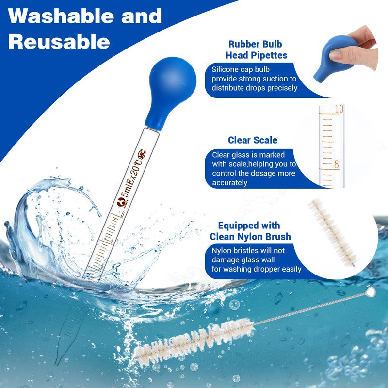 - 【Easy to Use and Clean】These clear glass droppers are equipped with brush for easily to clean, are reusable after cleaning, detachable rubber bulbs, rinse glass pipette stems with warm water.
