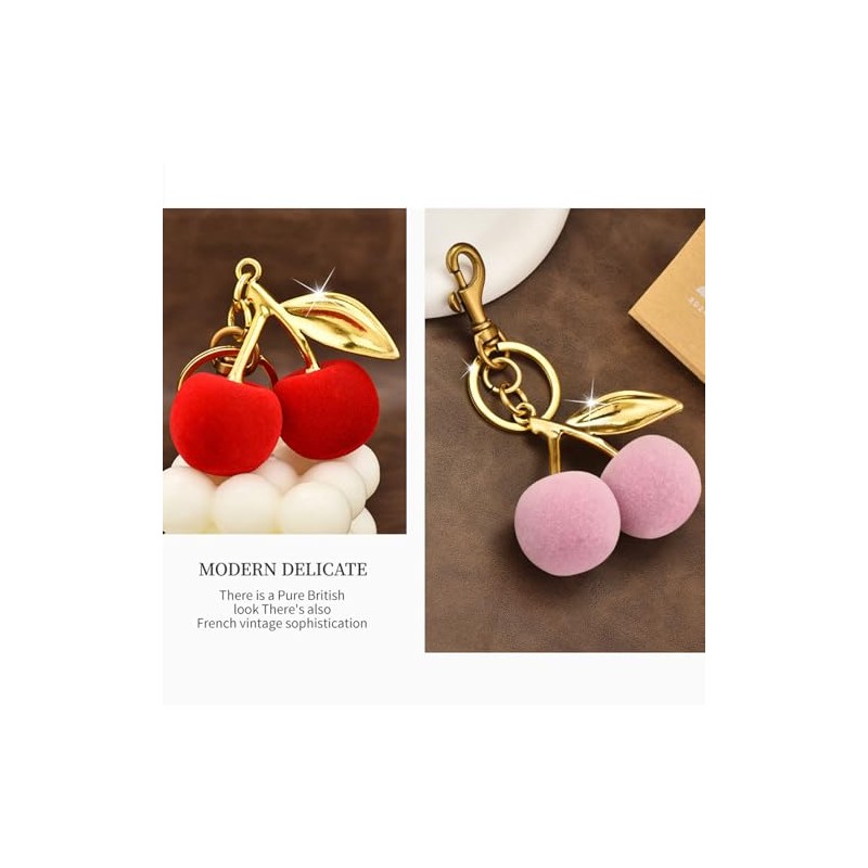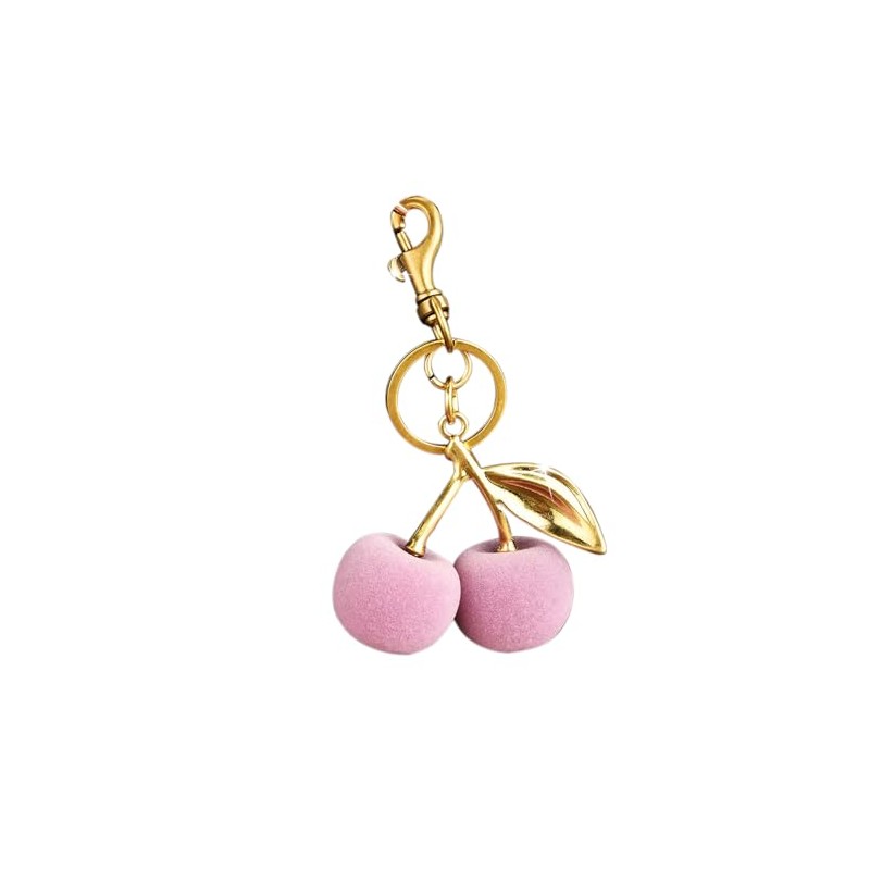 - DESIGN: Adorable cherry-shaped keychain featuring soft pink suede cherries with elegant gold-tone stems and leaf accents