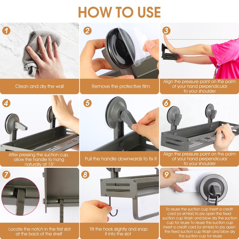 - Powerful & Durable Vacuum Suction: Engineered with dual vacuum suction cups, our shower caddy locks securely in seconds by simply lifting the lever, pressing down, and sealing the lever, and pull the lever back down .Holds up to 33 lbs effortlessly—ideal for heavy bottles, toiletries, and bath essentials.