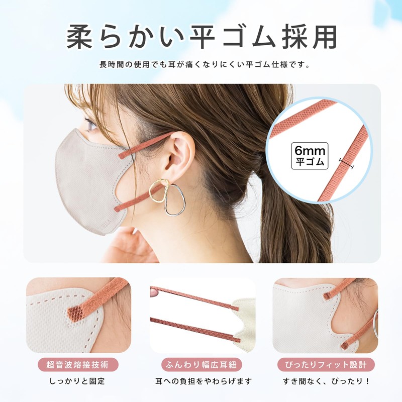 - 幅6mmの柔らかく高い伸縮性を持つ耳紐を採用し、長時間の着用でも耳に負担がかかりにくい設計です。
