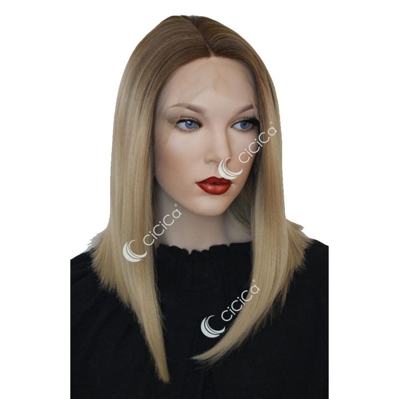 CiCiCa-“KATE”, Synthetic Lace Front Wigs, Soft Lace Wig, 16 Inches Medium Length Wig, Straight Wig, Bob Wig, Ombre Brown Roots to Mixed Blonde Wig, Premium Synthetic Heat Resistant Hair Replacement Wigs for Women.