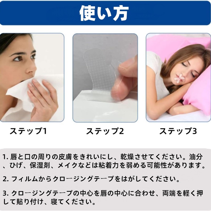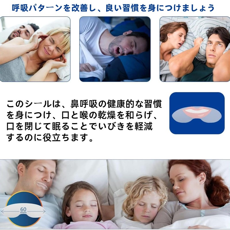 - 口呼吸防止:口呼吸は、睡眠中に細菌の吸入、いびき、よだれ、喉の乾燥を引き起こします。 口呼吸が長引くと、外見に影響を与える可能性があります。いびき防止テープ口呼吸による乾燥やいびきを軽減し、深い熟睡をサポートします。毎日の睡眠が快適になります