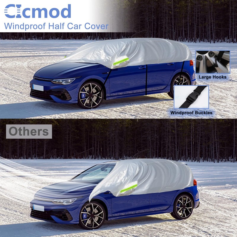 • For All Seasons: The half car cover prevents your compact suv/hatchback from sun damage and keeps interior cool in summer. Blocks the fallen leaves in Autumn. Keeps frost/snow off your windscreen and side mirrors.