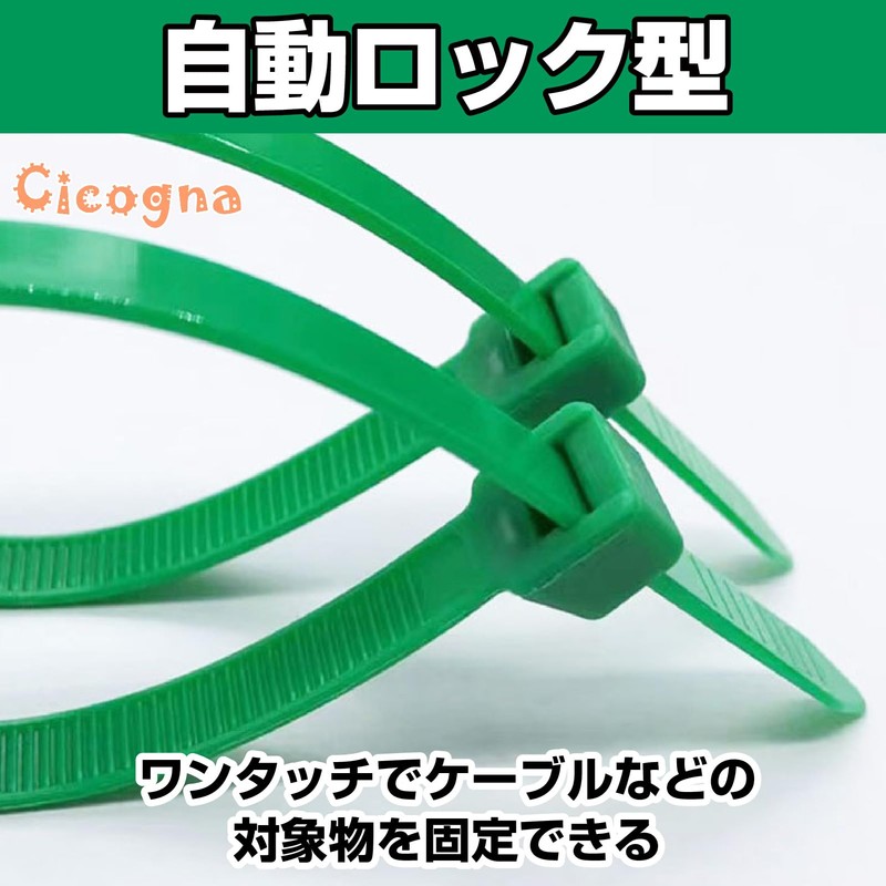 Green nylon cable ties with a large capacity for peace of mind and convenience. Great for agriculture, gardening, and more. You can secure objects such as cables with one touch.