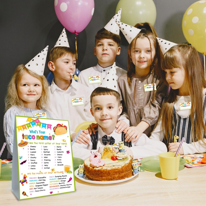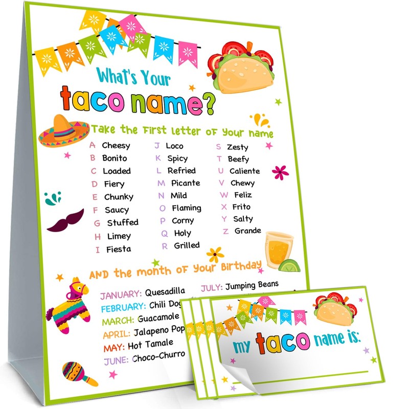 Cidobi What is Your Taco Name Game, 1 Taco Name Game Double Sided Sign, 30 Taco Name Stickers, Birthday Party Game Set, Games for Party Activity Decoration