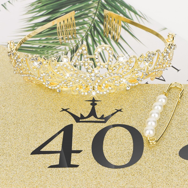 CIEHER 40th Birthday Crown + 40 & Fabulous Birthday Sash + Pearl Pin Set, Gold 40th Birthday Tiara, 40th Birthday Gifts Women Friends, 40th Birthday Decorations for Women