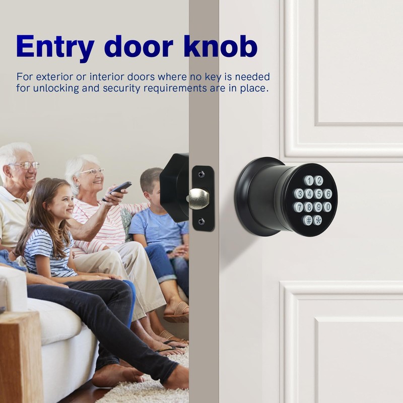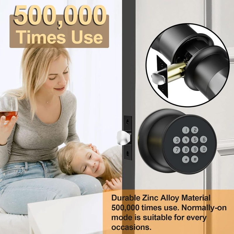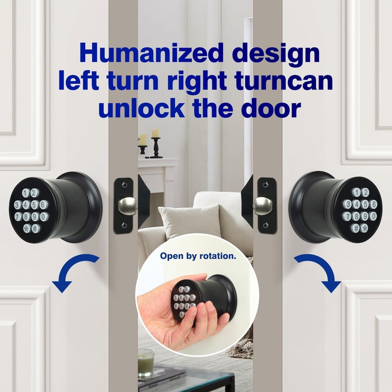 - Keyless door knob---This door knob provides 100 access codes,each user can set a separate password.Supports 6-12 bit user code.