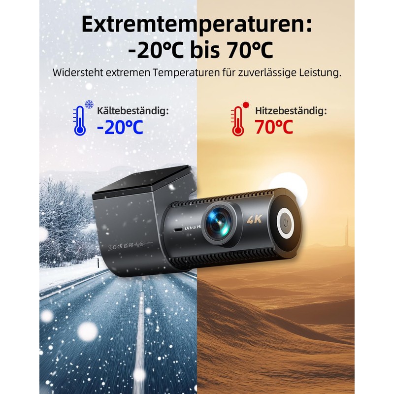 • Resistance to extreme temperatures: The super capacitor, ideal for high-quality dash cams, charges quickly, provides high storage efficiency and a long service life, extending the use by up to 30%. Its resistance to extreme temperatures (-20°C to 70°C) and its higher stability make it safer.