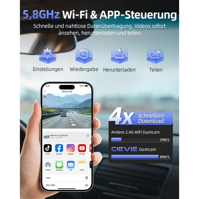 • 5.8 GHz WiFi & 4x faster: our dash cam supports 5.8 GHz WiFi, which transmits 4K videos 4x faster than the standard 2.4 GHz. Through our app, you can stream live, download videos, share your rides on social media or provide HD evidence of accidents. No cable, no PC, just instant access.