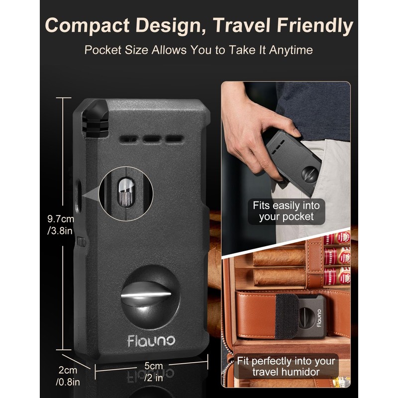 - Travel-Friendly - The cigar lighter is more lightweight than others, its compact design makes it easy to fit in your pocket or travel humidor. The cigar lighter comes with a larger, visible fuel tank, so you can easily monitor the butane level at a glance. And a full refill allows you to evenly light more than 30 cigars, ensuring you won't be caught off guard when you're hiking, traveling, golfing, fishing, on business trips, or party