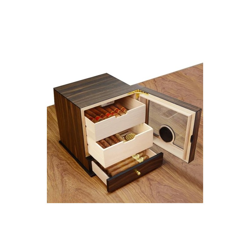 Elevate your cigar storage experience with this premium compact cigar humidor. Designed for both beginners and seasoned collectors, it offers superior sealing and proper ventilation to maintain optimal humidity levels. The two spacious drawers allow you to categorize your cigars by brand, size, or aging period, ensuring they remain in pristine condition. The external accessory drawer, lined with velvet, keeps your cigar tools neatly organized and easily accessible.Crafted from high-quality wood with a polished finish and unique wood grain, this humidor adds a touch of elegance to any space. The metal fittings and glass doors enhance its sophisticated design, making it a perfect decorative piece for your home or office.