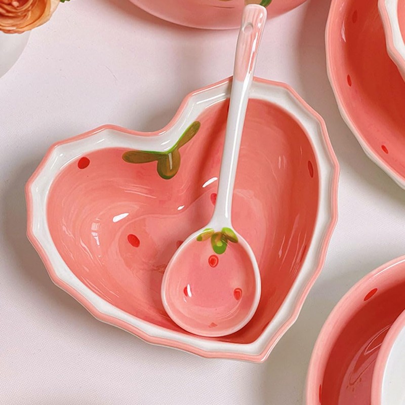 Housewares. The set is perfect for serving fruit, snacks and other small items and the spoon can be used for stirring or scooping. Decorative salad bowl, whether at home, school or in the office. This set is a practical and stylish. The ceramic heart shaped salad bowl adds a touch of cuteness to your kitchen, while the bright colors make it even more attractive. Wear-resistant tableware made of ceramic material, this set is safe, durable and easy to clean. The delicate serving plate, the sweet heart-shaped strawberry bowl and spoon set, a must have for every household