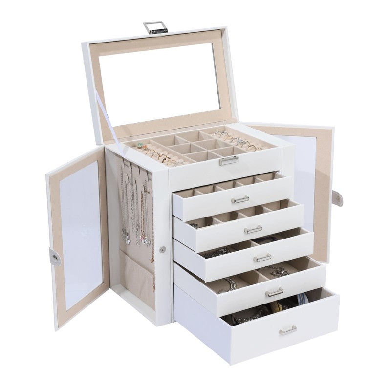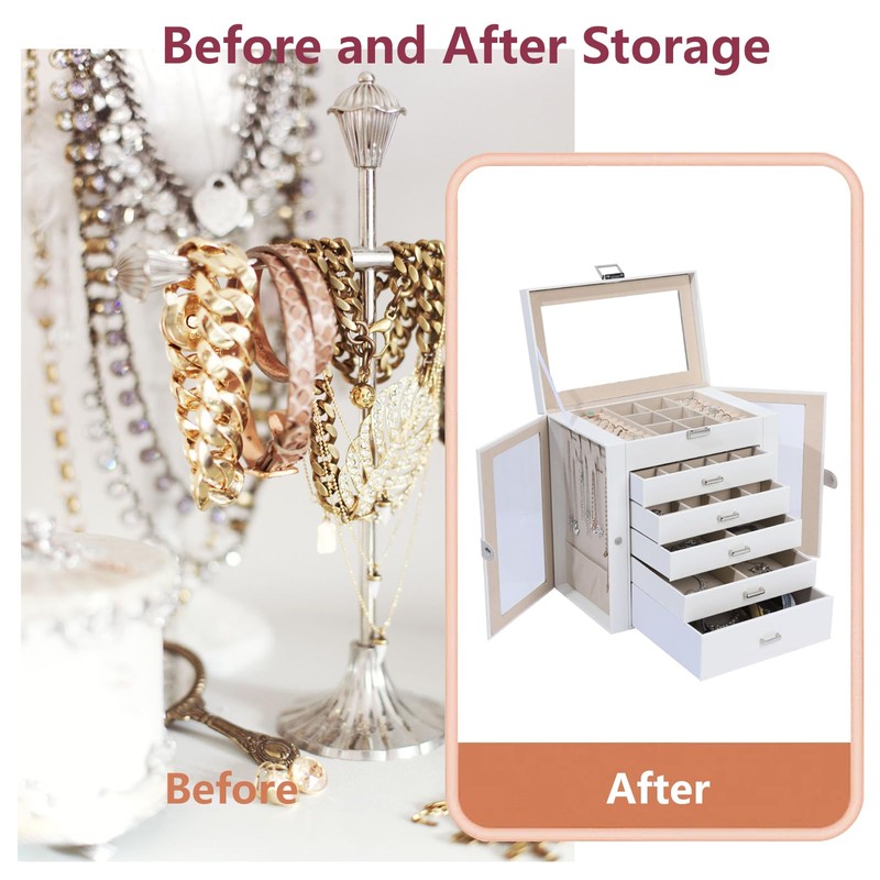 - 【 6-Layer Large Jewelry Box Features 】: The large jewelry storage box has 5 drawers, 2 necklace side glass door boxes (with 8 necklace hooks and 2 elastic bags to protect necklace), the top of the first layer has a makeup mirror, 2 rows of ring slots (can store 30 rings) and 6 earrings grids.