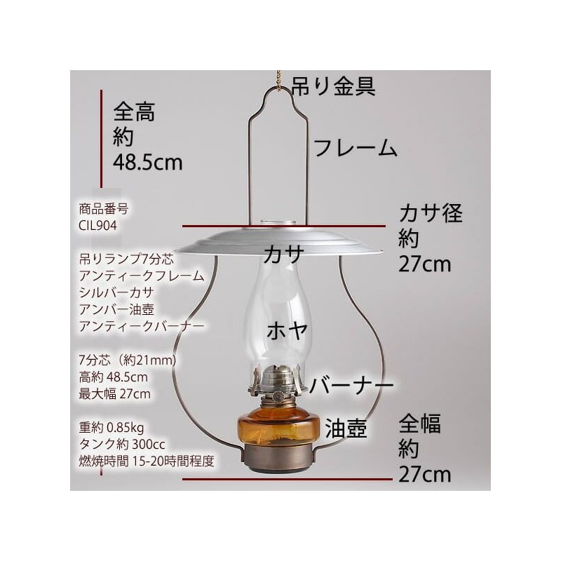 - This is a "hanging lamp" with a retro-style atmosphere. This is a reproduction of the old nostalgic appearance of the Silver Ship. Traditional, the lamp part can be easily removed from the frame for easy oil changing, extinguishing, and can also be used as a table lamp. The well-designed frame part is made of thick 0.2 inch (4 mm) brass wire and the base of the oil urn is also 0.08 inch (2 mm) brass plate which is durable, flexible and resistant to deformation. The wick is 7 minute core, approximately 21mm wide, and is one of our oil lamps with a brightness of about 15W incandescent bulbs. The size is easy to use, and it is a practical item that is useful even in the event of a power outage. The fuel can also be used with rainbow oil, but it can also be used with kerosene used in petroleum fan heaters. Size: Width 10.6 inches (27 cm) x Depth 10.6 inches (27 cm) x Height 19.1 inches (48.5 cm) (varies depending on product); Burn time approx. 15 hours - 20 hours, bonus 1: 7 min. lead 1 bottle ¥200