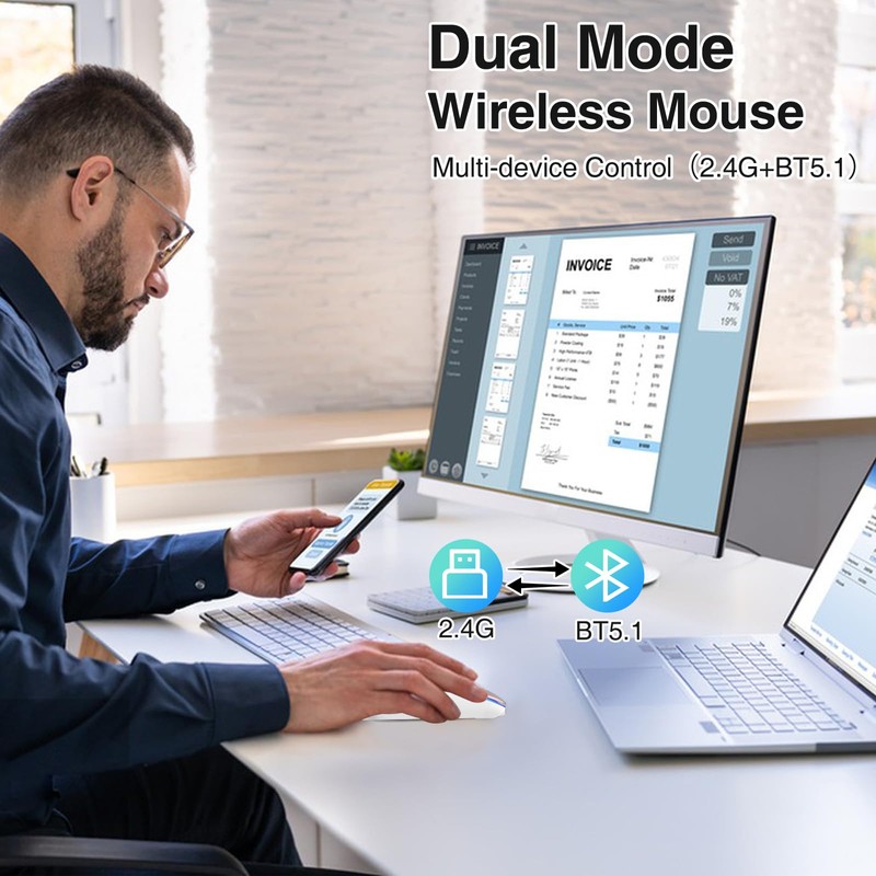 - Dual Mode Wireless Mouse: The laptop mouse offers an easy switch between Bluetooth 5.1 and 2.4G wireless connections, bringing stable and reliable performance. Stable connection with quick response and smooth tracking. Bluetooth cordless 5.1 ensures quick response and precise movement, while 2.4G provides plug & play convenience, no need for a driver. (USB receiver stored in the bottom of the bluetooth mouse)