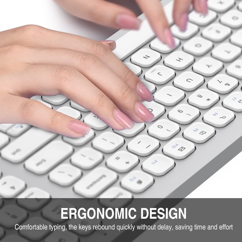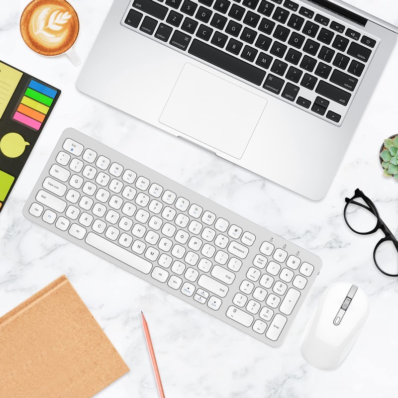 • ▶【Slim and Ergonomic Design】 The slim keyboard has a tilt angle for the great typing position.Sweat-resistant, skin-friendly finish wireless mouse in contoured shape would provide hours of work comfortably. The full size keyboard type fast with numeric keypad and instant.