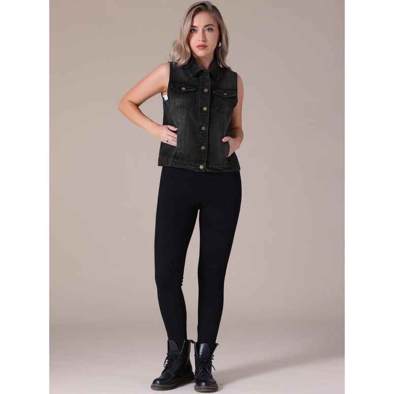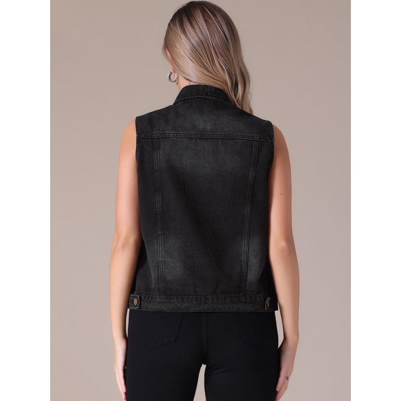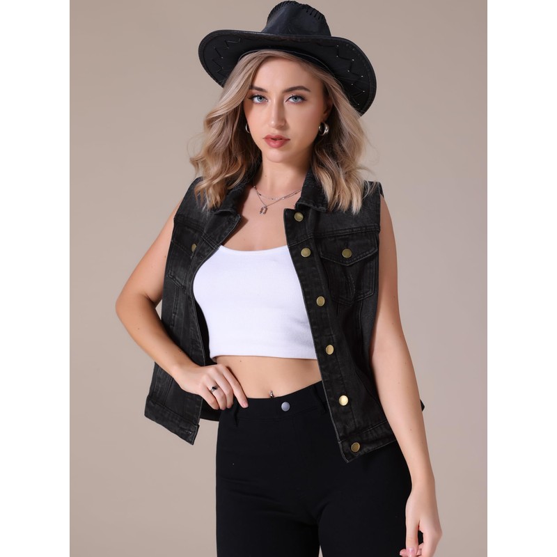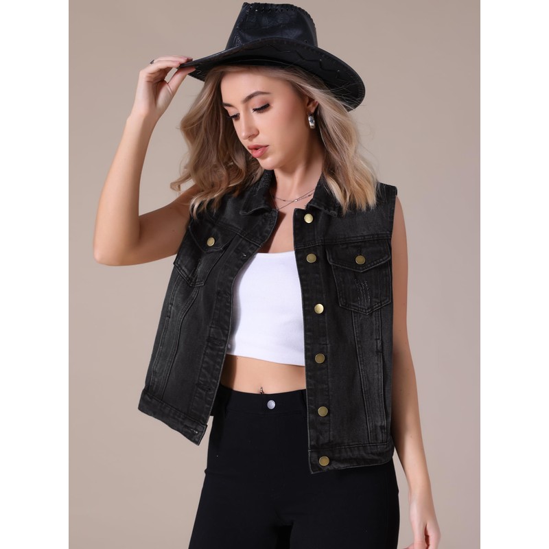 CIMUK Women's Denim Vest Button Down Jacket W Chest Flap Pockets Washed Distressed Sleeveless Jean Jacket Medium Black