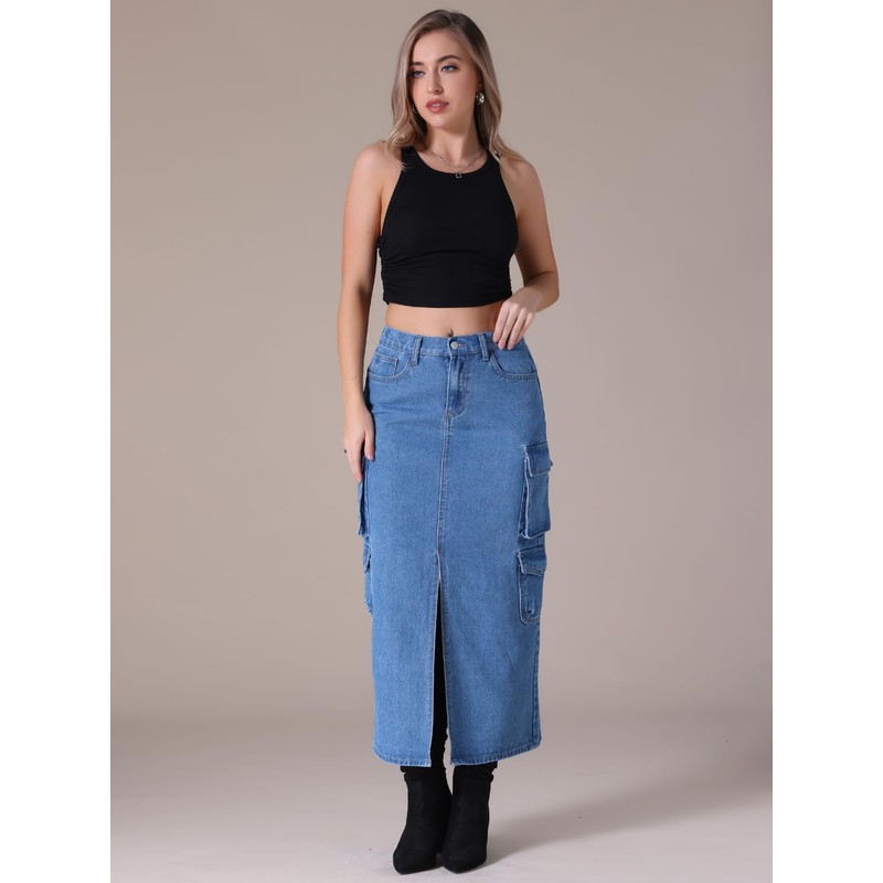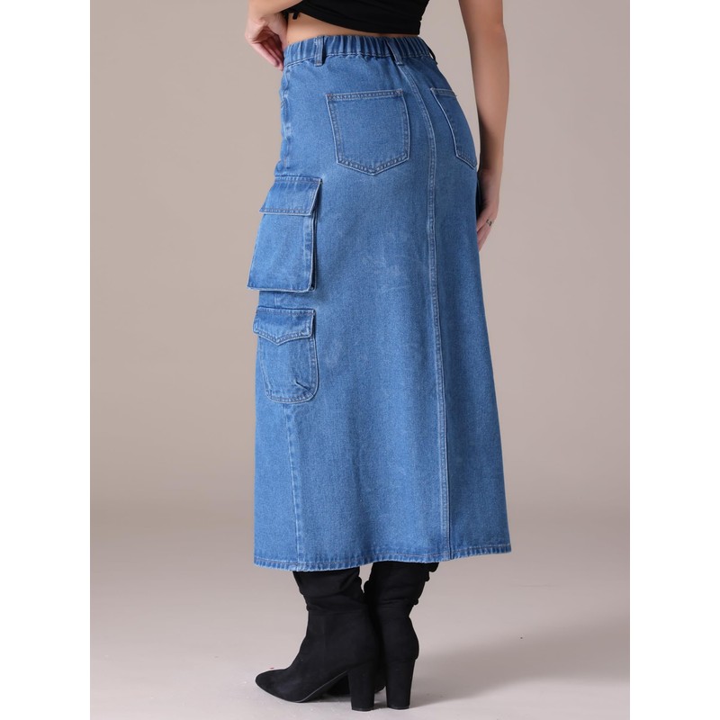 CIMUK Women's Maxi Denim Skirt Front Split Button Front Elastic Waist Streetwear Flap Pockets Cargo Jean Skirts X-Large Blue