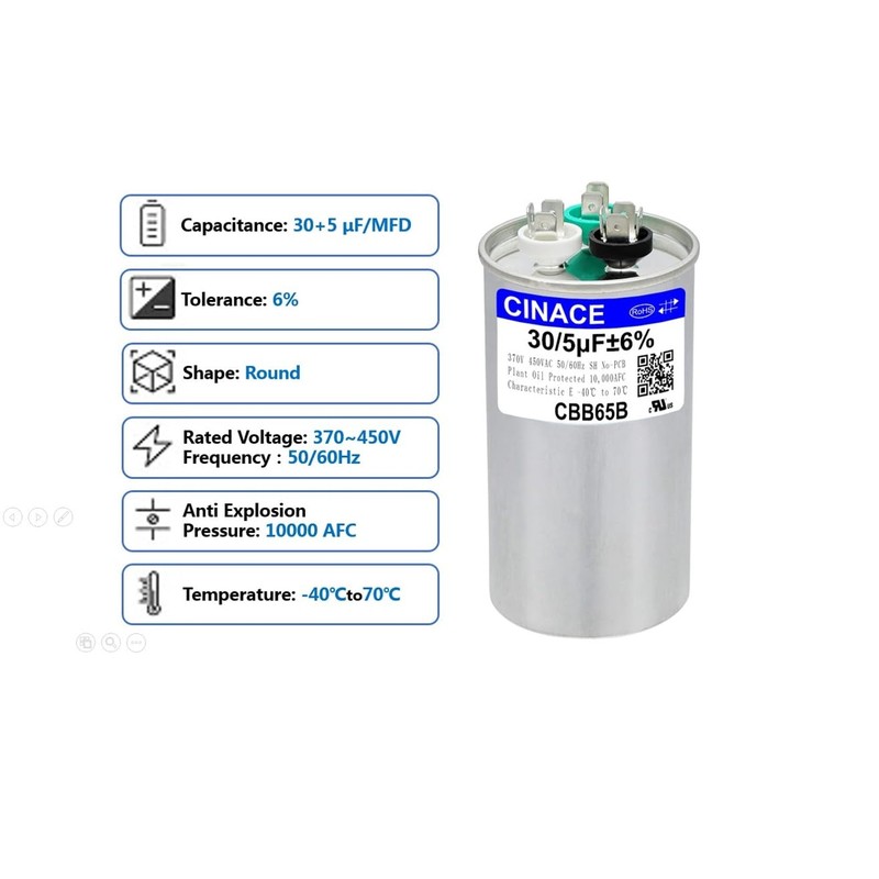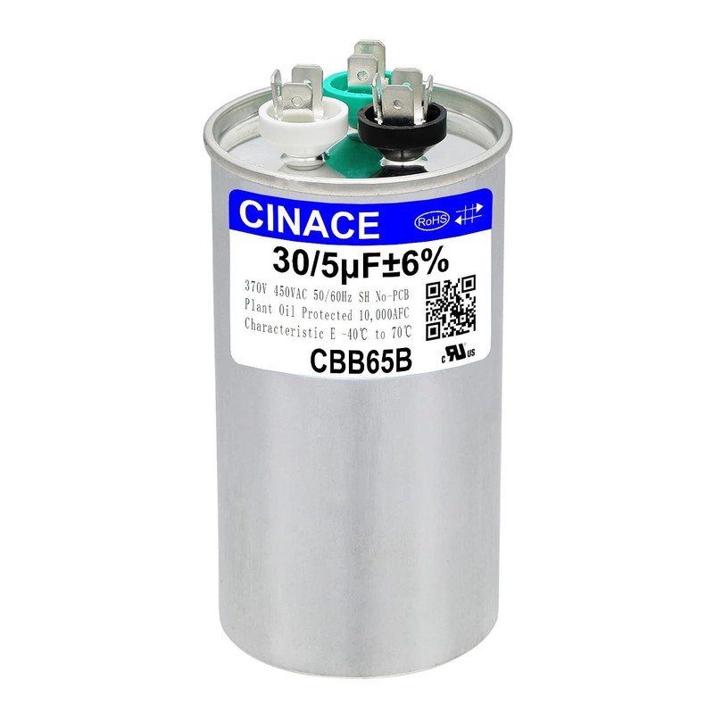The CINACE CBB65 dual run capacitor is a high-performance component designed for air conditioning systems, AC motors, fans, and HVAC applications. This round capacitor features a 30/5 microfarad rating with a 6% tolerance, operating at 370-450V AC and 50/60Hz frequency. Built to withstand demanding conditions, it functions reliably in temperatures ranging from -40°C to 70°C. The capacitor's robust construction includes a 10000 AFC anti-explosion pressure rating for enhanced safety. Its versatile design makes it suitable for various applications including air conditioner compressors, fan motors, heat pumps, condenser units, and ice makers. The round shape and sturdy construction ensure easy installation and long-term durability. This dual-purpose capacitor serves both as a run and start capacitor, making it an ideal replacement part for various HVAC system components. Each unit comes with clear specifications marked on its casing for easy identification and proper installation.
